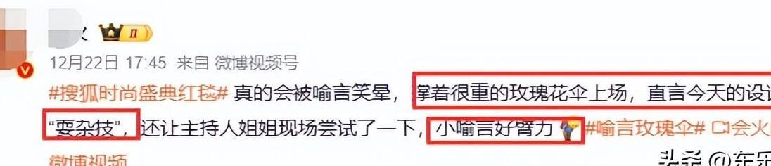 走到定点拍照时,喻言本想单手撑伞,却因伞的重量而险些失控。尽管她及时调整了重心,但现场观众仍然忍不住吐槽,戏谑她为了博眼球,上演了一场杂技。喻言的尴尬或许可以理解,毕竟她是娱乐圈的新生代,为了事业不得不在激烈的竞争中抢镜。