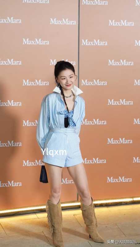 她的造型跟别人好像不在同一个季节,其他女明星都是整秋冬款,她还停留在清凉的夏天。一套蓝色的条纹短裤套装,搭配靴子露出大长腿。