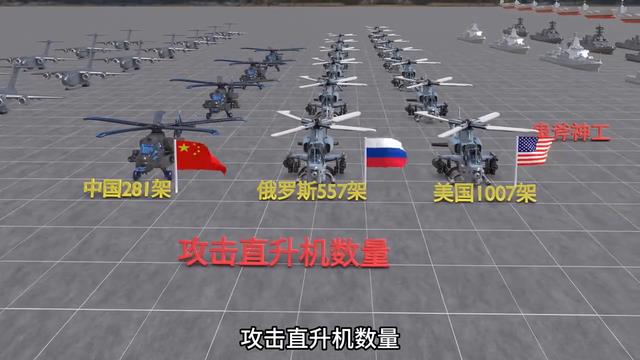 ·攻击直升机数量:中国281架,俄罗斯557架,美国1007架。