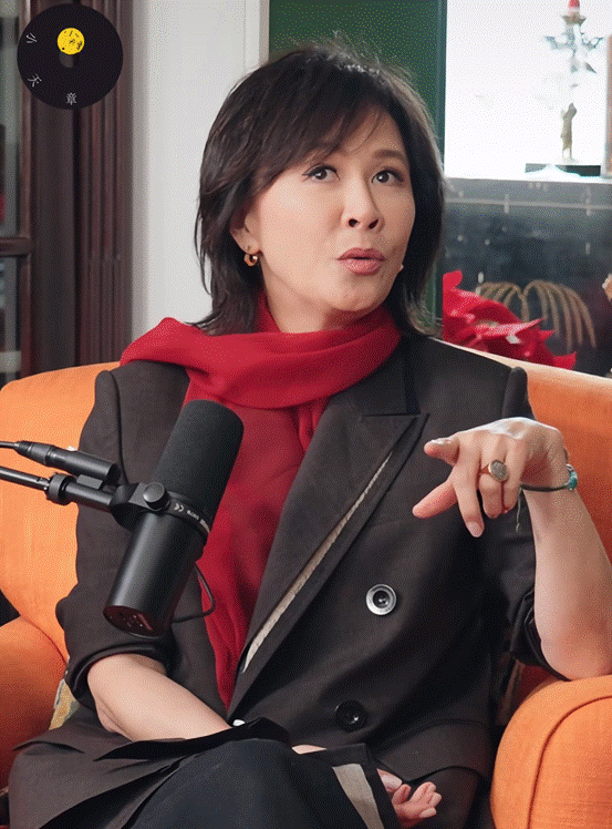 她的妆容走的是大气挂路线,精致的眉形勾勒出眉眼的英气,复古红的唇色气场全开,笑起来时眼角的细纹都带着故事感,整个人坐在那里,就是历经千帆仍从容的最好写照。