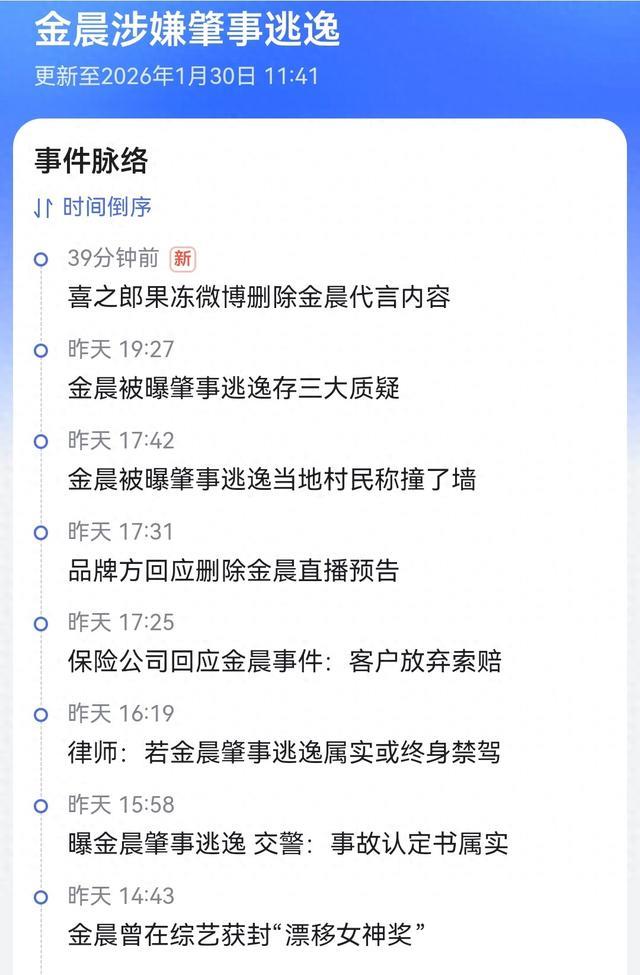 2026年1月29日晚上8点,某美妆品牌公关总监的手机响了。看到"金晨 肇事逃逸"的热搜词条时,她手里的咖啡杯差点掉在地上——就在24小时前,她们刚刚官宣金晨成为品牌代言人,直播预告已经铺满了全网。