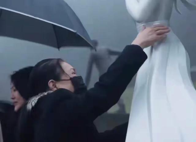 粉色薄纱缓缓滑落。一尊白色少女雕像静静立在雨中。她戴着蝴蝶结,长发被风吹起一角,双手轻轻交叠在胸前。这不是大S常见的模样,却让人莫名想起她年轻时那种倔强又梦幻的气质。