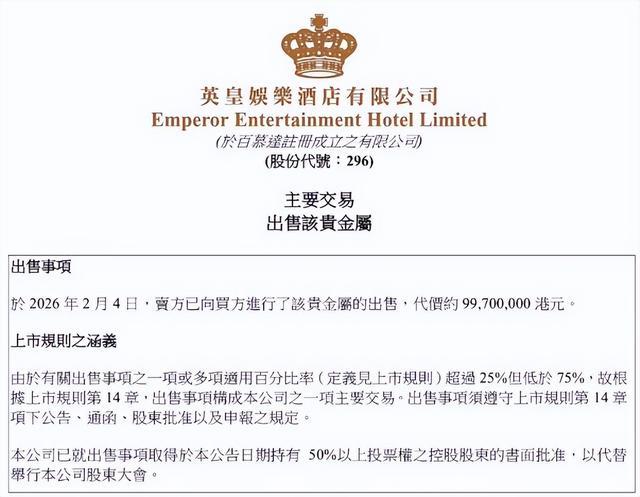 2月5日,媒体证实英皇娱乐把酒店大堂的标志“黄金大道”里的全部金砖给出售掉了。