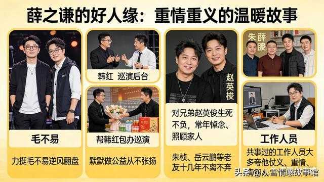 表面看,薛之谦的好人缘有目共睹。力挺毛不易逆风翻盘,帮韩红包办巡演,默默做公益从不张扬;对兄弟赵英俊生死不负,常年悼念、照顾家人;朱桢、岳云鹏等老友十几年不离不弃,共事过的工作人员大多夸他仗义、重情、肯帮人。