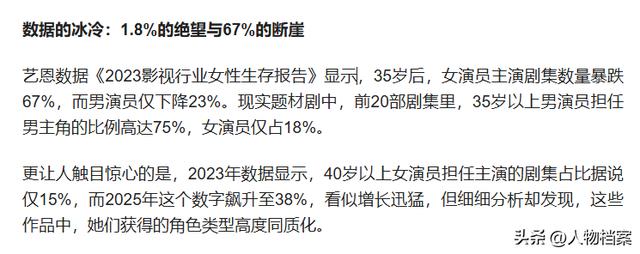 指出影视行业中,30 岁到 45 岁的女演员,获得的主要角色数量,不足同年龄段男演员的三分之一。