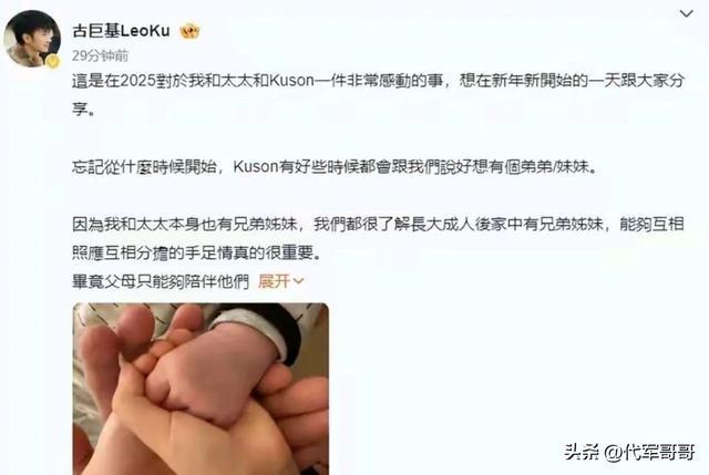 其实早在2026年元旦,古巨基就已在社交平台官宣二胎出生的喜讯,他晒出一家四口大手握小手的照片,配文透露,决定生二胎,很大程度上是源于大儿子Kuson长久以来的期盼——小家伙曾多次跟父母念叨,好想有个弟弟或妹妹陪伴自己。