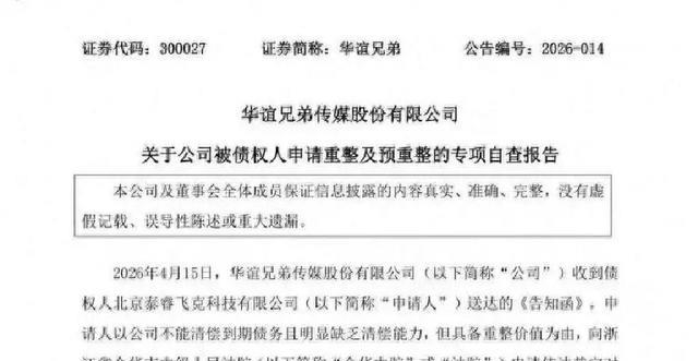 2026年4月15日晚上,一则简短的公告,把华谊兄弟这个久违的名字又推上了热搜。债权人北京泰睿飞克科技有限公司,向浙江省金华市中级人民法院申请对华谊兄弟进行重整及预重整,起因是一笔一千一百四十多万元的广告费,一年多没结清。对普通人来说,这是一个很遥远的金额;对一家曾经市值逼近九百亿元的公司来说,却又显得异常刺眼。