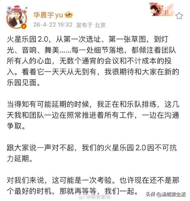 一场延期,照见的是责任与格局。比起完美的舞台,这份直面意外的担当、守护粉丝的真诚、共渡难关的默契,更值得被看见。暂别是为了更炽热的重逢,等风雨过后,火星乐园定会如约绽放 。…#华晨宇算华语乐坛的领军人物么##华晨宇##你如何评价华晨宇##华晨宇算顶流明星吗##华晨宇为什么这么多人喜欢#