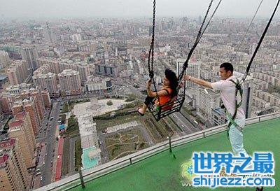 这是国内设置高度最高的秋千,也许是世界上最高的秋千了,它位于哈尔滨龙塔210米高的平台上。被称做“勇敢者的游戏”。如此恐怖的高度,荡出去甚至看不到脚底的平台,要坐到上面确实需要很大的勇气。