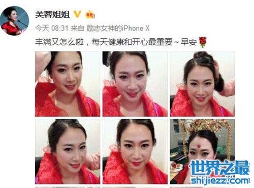 芙蓉姐姐发布一组照片,称:丰满又怎么啦,每天健康和开心最重要~早安。芙蓉姐姐只是个业余的"歌手",可她也打死不"假唱",这份认真和坦率令人赞叹。芙蓉姐姐没被世俗束缚,没因侮辱退缩,没被口水淹没,没被流言吓倒。