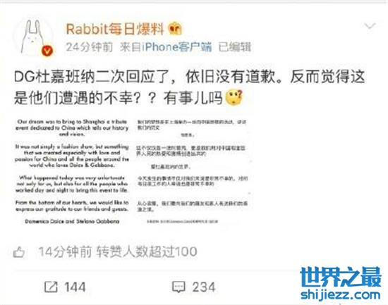 杜嘉班纳再发声明却是抱怨的情绪