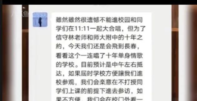 就这样,这首歌成了东北师大附中的第二校歌。以后每到双11这一天,学生们都会不约而同地汇集在走廊唱响这首歌,老师也被感染,为他们放起伴奏。 2017年,原唱林志炫偶然在网上看到了这个合唱视频,于是他在评论区留下了美丽的承诺。活动进行的第十年,他会亲自去现场和同学们一起合唱。看到评论大家都很兴奋,但很快就被现实浇了一盆冷水,因为学校根本请不起这么大牌的明星。但以后几年的双11,林志炫都会发微博说自己会记得跟同学们的十年之约,这让大家又燃起了希望。可2020年突如其来的一场疫情,又使他们陷入了绝望。附中的学生们万万没想到,林志炫真把这件小事记在了心里,他提前一个月便放下所有通告全力准备这件事,他先从台北飞到了上海隔离,又转到长沙完成工作,随后在十日当晚紧急飞到了长春。可由于疫情原因,校长拒绝了他进学校的要求,于是他让助理转达了个他只在校外看一眼的请求,