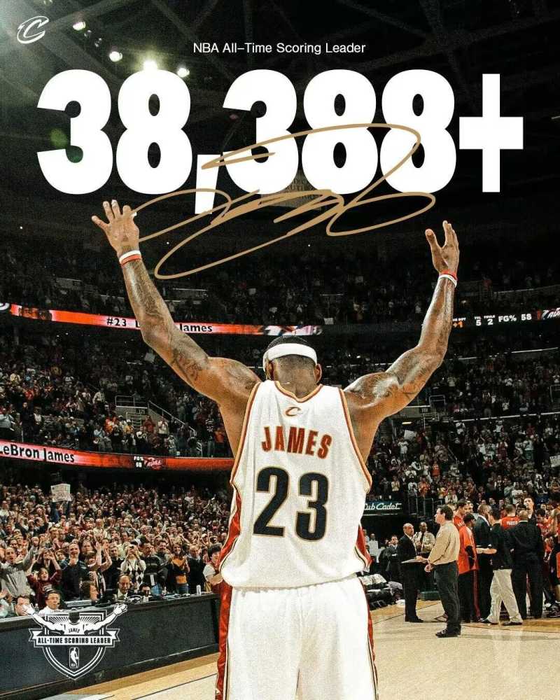 在面对俄克拉荷马雷霆队的比赛中,洛杉矶湖人队球员勒布朗·詹姆斯在比赛第3节最后时刻,通过中距离后仰跳投得到本场比赛个人第36分。至此,詹姆斯的NBA职业生涯常规赛总得分达到38388分,超越名宿贾巴尔,排名历史第一。