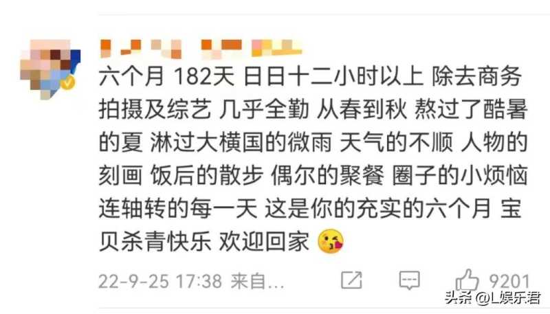 刚杀青的《骄阳伴我》,男主演的微博下是一片“杀青大吉”的温暖欢迎,女主演杀青微博下的第一条热评: