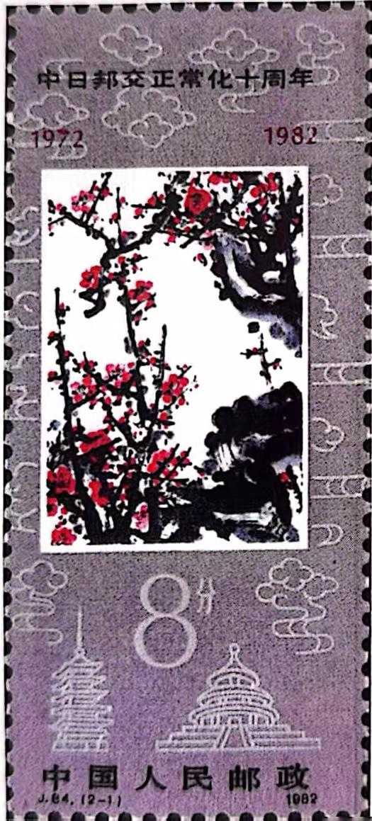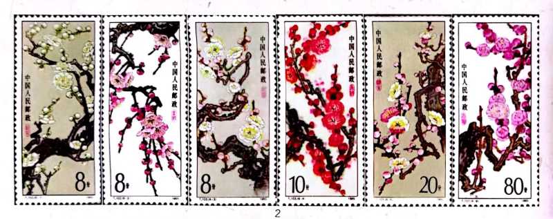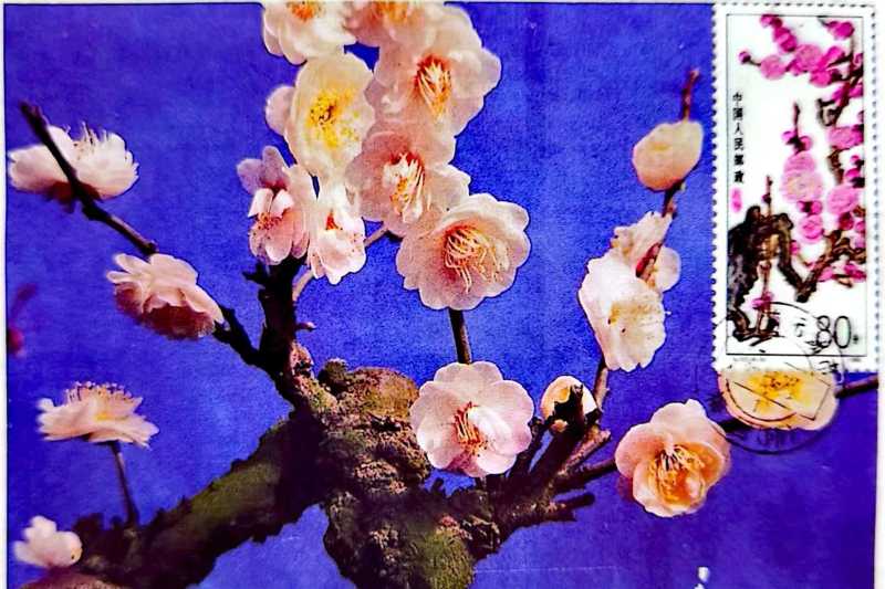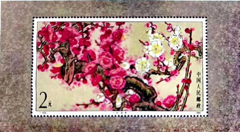 梅花(图1)又名春梅、红梅、干枝梅,为蔷薇科植物,落叶乔木,少量灌木,主要分为花梅和果梅两类,株高约5--10米,花先于叶开放,花瓣娇小玲珑,香味浓。梅花原产于我国南方,6000年前即已经分布于长江以南地区,3000年前即引种栽培,可分为真梅系、杏梅系、樱李梅系等,品种达300多种。梅花属于长寿花卉,即使是在家盆栽,也经常可以养到10年以上。湖北黄梅县有株1600多岁的晋朝所植梅花,至今仍吐芬芳。适宜观赏的梅花种类包括大红梅、台阁梅、照水梅、绿萼梅、龙游梅等,多为白色、粉色、红色、紫色、浅绿色。1985年发行的 T .103《梅花》特种邮票中,1套6枚邮票(图2)和1枚小型张(图3)表现了我国众多梅花品种中最具代表性的绿萼、垂枝、龙游、朱砂、洒金、杏梅、台阁、凝馨。公元前2世纪,梅花被引种到朝鲜,4世纪引进到日本,又从日本传到欧、美及澳大利亚等地。