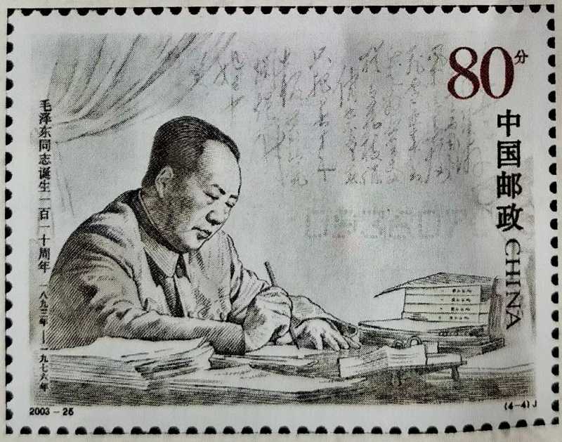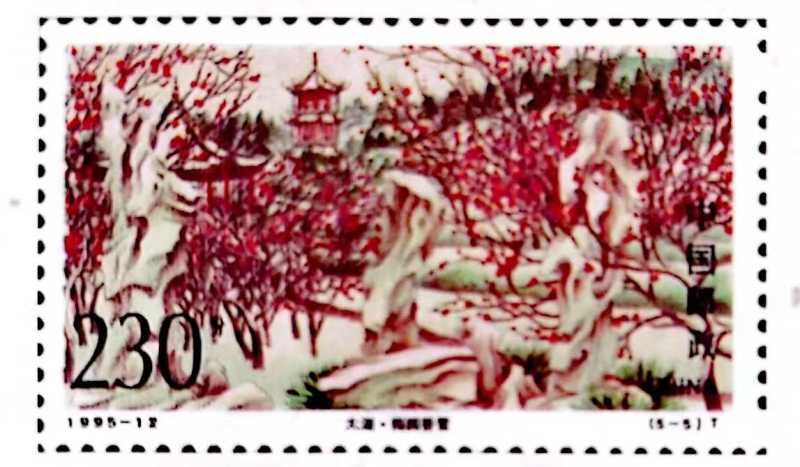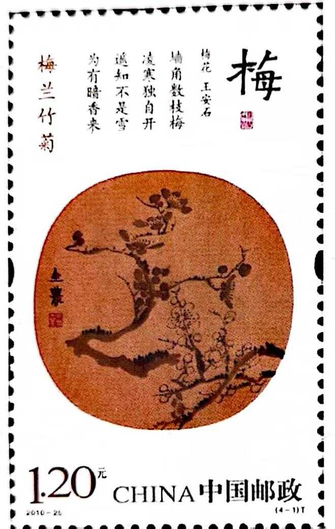 一代伟人毛泽东亦对梅花情有独钟,他的诗词气势磅礴、绚丽多姿且内涵丰富、韵味深远。在他众多的诗词中,《卜算子·咏梅》一词格调高雅、秀丽清新,尤为人们所喜爱,传诵甚广。在2003-25《毛泽东同志诞生一百一十周年》邮票中,第4枚邮票(图11)画面的背景就是毛泽东所作的《卜算子·咏梅》:“风雨送春归,飞雪迎春到。已是悬崖百丈冰,犹有花枝俏。俏也不争春,只把春来报。待到山花烂漫时,她在从中笑。”毛泽东笔下的梅花美丽、积极、坚贞,笑傲风雨,隐喻了新时代革命者的操守与傲骨。