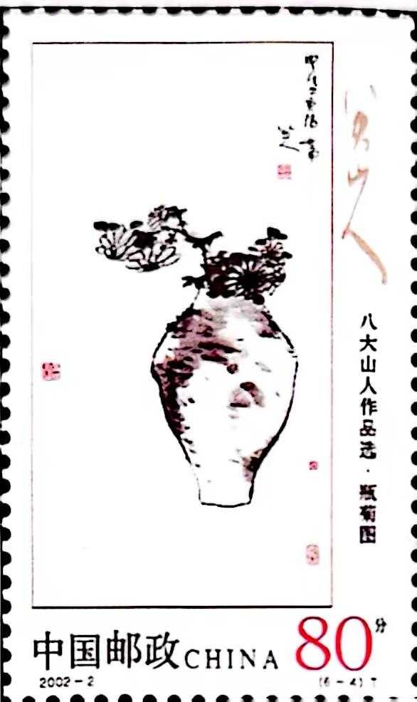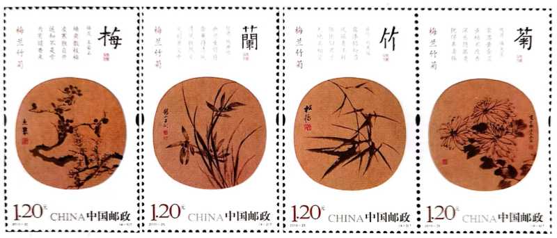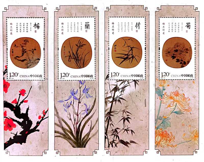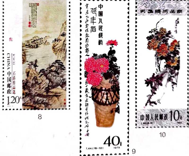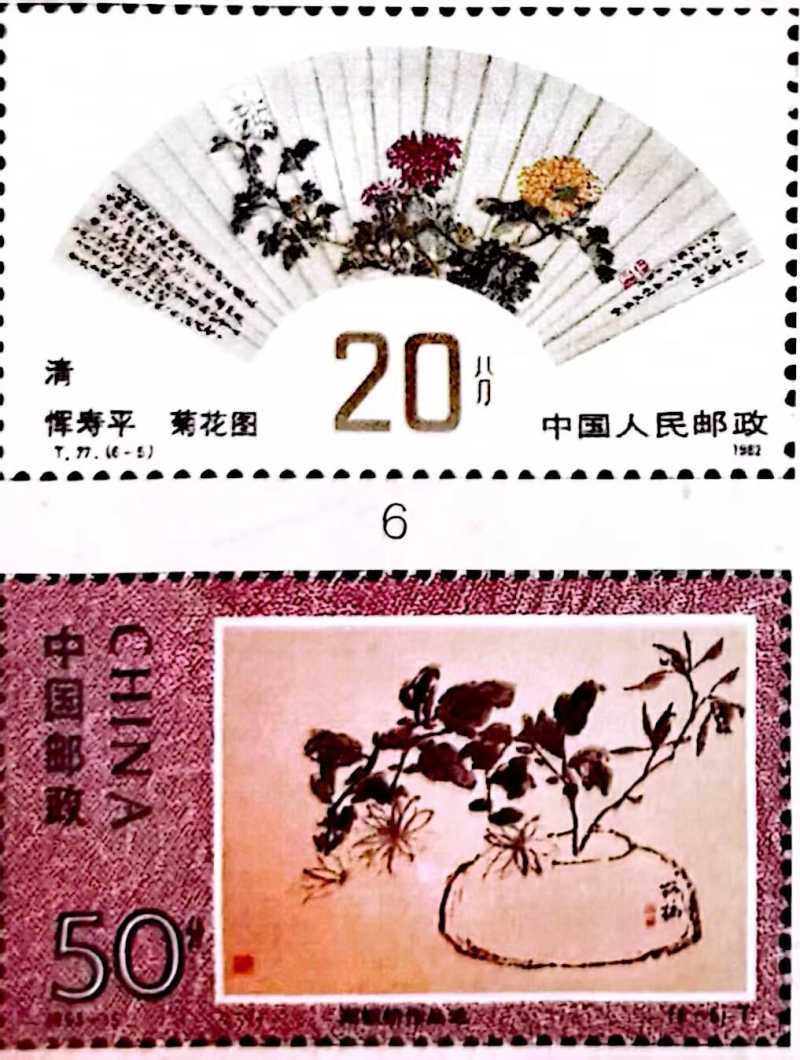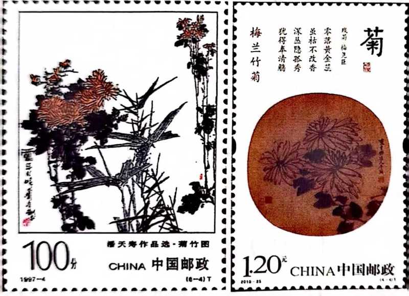 菊花也是中国绘画艺术中的重要表现题材,星在五代时期菊花就已成为绘画素材。据北宋《宣和画谱》记载,唐末画家滕昌裕“卜筑于幽闲之地,栽花竹杞菊,以观植物之荣悴而寓意焉,久而得其形似于笔端”,并收录其《寒菊图》一幅,这是中国古代绘画史上最早关于画菊的明确记载。唐末菊画多以“寒菊”为意象,以表傲霜斗寒的凛然气节,如黄荃的《寒菊蜀禽图》、黄居案的《寒菊鹭鸶图》、徐熙的《寒菊月季图》等。入宋以后,画菊者渐多,赵昌的《拒霜寒菊图》《木瓜寒菊图》是其中的代表,他画的菊花极具神韵,苏轼曾为其菊画题诗:“轻肌弱骨散幽葩,真是青裙两髻丫。便有佳名配黄菊,应缘霜后苦无花。”这也是目前所见最早的菊花题画诗。到了明清,菊花绘画达到鼎盛,名家精品迭出不穷,菊花在画中的意象和内涵也更加丰富。这一时期著名的画作有明代吕纪的《桂菊山禽图》、米万钟的《竹石菊花图》、陈洪绶的《玩菊图轴》,清代八大山人的《瓶菊图》(图5)、恽寿平的《菊花图》(图6)、郑板桥的《瓶菊册页》(图7)、石涛的《对菊图》(图8)等。及至近代,菊花仍是国画大师们的"座上宾",齐白石、吴昌硕、潘天寿、陈半丁、何香凝等众多名家均留下了菊作佳品,其中齐白石的《菊花》(图9)、吴昌硕的《秋菊》(图10)、潘天寿的《菊竹图》(图11)等分别作为各自代表作入选“书画名家作品选”系列邮票。中国邮政曾于2010年以"花中四君子"为主题发行《梅兰竹菊》特种邮票1套4枚,第4枚“菊花”主图选用了清代画家李辉的《菊石图》画作,并配以北宋诗人梅尧臣的《残菊》诗作:“零落黄金蕊,虽枯不改香。深丛隐孤秀,犹得奉清觞”,以“古诗配古画”形式展现了菊花冷艳清贞的超然气节,也将咏菊文学与菊花绘画完美融合于方寸之间(图12)。