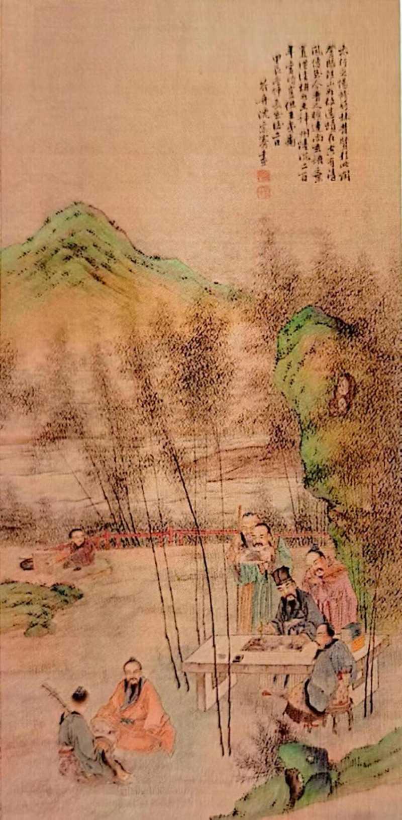 千百年来,竹子被化身为谦谦君子,成为品性高雅的象征。《诗经》中云:“有匪君子,如切如磋,如琢如磨”“有匪君子,终不可爱兮”,将士大夫的外貌、才能、品德与竹相关联起来,赞誉其优秀之处。而历朝历代的文人墨客,已对竹子产生了近乎痴狂般的偏爱。魏末晋初的“竹林七贤”(图8),遁隐竹林,与竹为伴,喝酒纵歌,抒发内心情感,其人其诗都与竹子有着密切的联系,体现了传统文人超凡脱俗的审美理想与返璞归真的生活意趣。