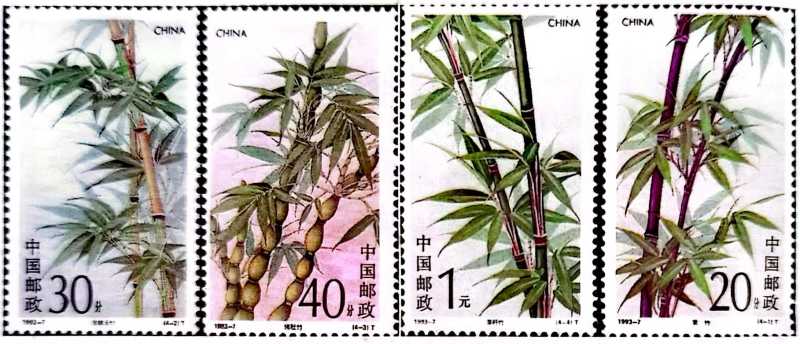 自古以来,竹子在我国就有广泛分布。在《山海经》中记载的300多座山中,有竹的山便占据了30多座,其中在卷三《北山经》中有这样的句子:“又东二百里,曰京山,有美玉,多漆木,多竹,其阳有赤铜,其阴有玄硝”,可见竹子在我国的分布之广。中国不但是世界上竹类资源最为丰富、竹林面积最大、开发利用最早的国家之一,也是现代竹子的分化和分布中心,约有400--500种,约占世界已知竹种的1/3,被誉为“竹子王国”。其中,紫竹、金镶玉竹、佛肚竹、茶轩竹、毛竹曾荣登1993-7《竹子》特种邮票(图2)及其小型张(图3)。我国作为原产地之一,浙江、江西、江苏、四川、湖南、云南和重庆等都有大量不同种类的竹子分布且形成规模巨大的特色竹林,如茶山竹海、宜兴竹海、蜀南竹海(图4)、安吉竹海等是著名的竹林观赏地,更有众多著名的竹子公园,如北京紫竹院(图5)、济南万竹园、扬州个园(图6)、成都望江楼公园等。