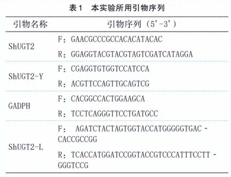 以目标基因cDNA序列为基础,以GAPDH为内参考基因,设置了ShUGT2-YF、ShUGT2-Y-R(图1),上海生工BET技术公司进行了引物序列测定及合成。