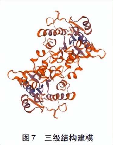 呈不规则螺旋状的氨基酸214个,比例为36.09%(见图6),利用同源性模建,获得了这种氨基酸产品的三维立体图形(图7)。