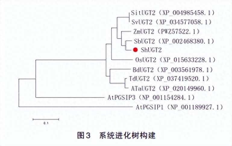 通过比较不同的氨基酸(如图2)以及建立的系统进化树(如图3)可以看出,ShUGT2与高粱的SbUGT2、玉米的ZmUGT2、谷子的SitUGT2、狗尾草的SvUGT2等基因的序列相似度很高,尤其是与高粱的SbUGT2基因的同源性最高,达92.45%。