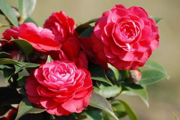 山茶,山茶科山茶属常绿灌木或小乔木植物。明代李时珍亦曰“其叶类茗,又可作茶饮,故得茶名。”山茶植株形姿优美,叶片浓绿有光泽,花形艳丽缤纷,四季常春,是中国重要的植物造景材料之一,亦可用作插花、切花材料,还可大规模种植成专类园,观赏价值极高。