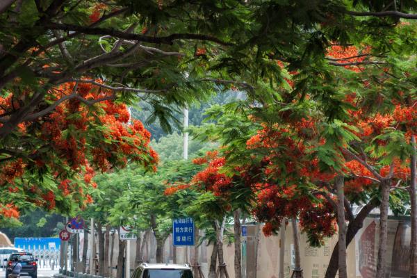 凤凰木为豆科凤凰木属植物,花期在5~7月,其花朵为红色,开花的时候极为艳丽,和周围绿色的叶子形成一种强烈的对比,更显美丽。