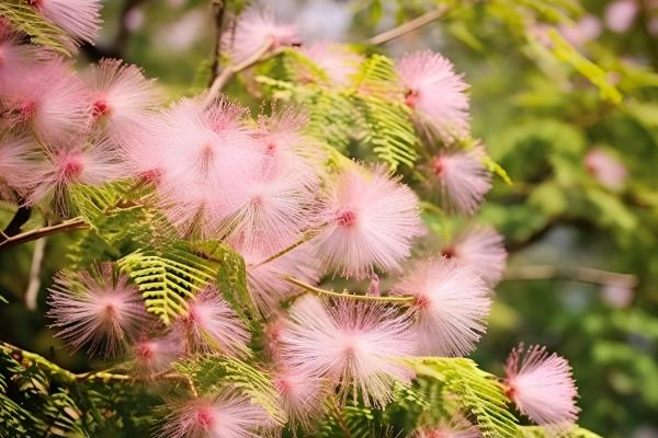 合欢树为豆科合欢属的落叶乔木,花期为6—7月,花朵如绒簇,看上去有一种朦胧迷幻的美丽,因此常被作为城市行道树、观赏树。