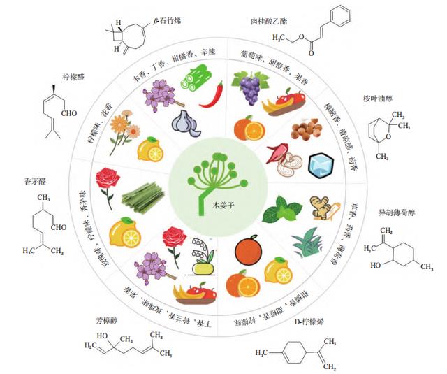 研究发现,给木姜子带来特殊香气的主要是柠檬醛、β-石竹烯、香茅醛、芳樟醇等挥发性香气成分。