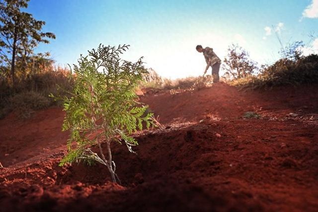 雨水冲刷出千沟万壑的红土地上,栽植于去年11月19日的崖柏迎风矗立,在彩云之南的阳光下茁壮成长。