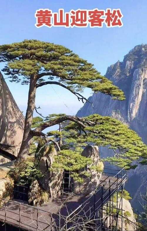 特点:其姿态如人在挥手迎客,象征着友好和友谊,是人民大会堂铁画《迎客松》的原型,也是黄山“四绝”之一。