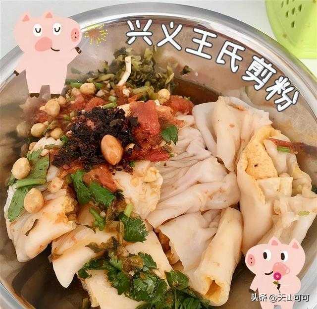 兴义人把吃剪粉称为"剪一顿",可见其痛快。宽粉皮摊在案板上,老板娘手持大剪刀"咔嚓"几下剪成菱形,浇上秘制酱料:油辣椒用花溪辣椒与遵义辣椒按比例调配,蒜水需现捣现用,再淋一勺灵魂的西红柿熬制的酸汤。食客端着碗站在路边就能大快朵颐,粉皮滑溜裹满酱汁,酸辣直冲天灵盖。