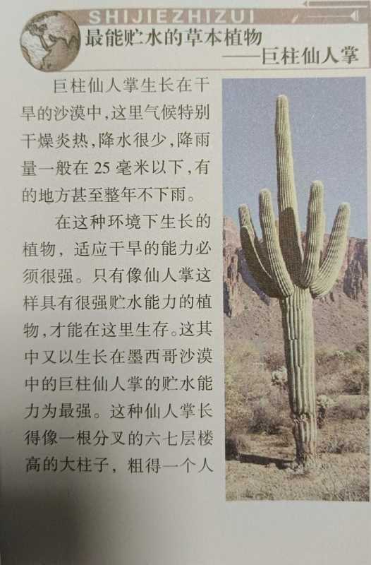 它的主茎粗壮挺拔,呈柱状,可长到12-15米高,最高能达20米,茎干上有明显的棱,棱上长着短刺。为适应沙漠环境,它的茎能储存大量水分,叶片退化成刺减少蒸发。