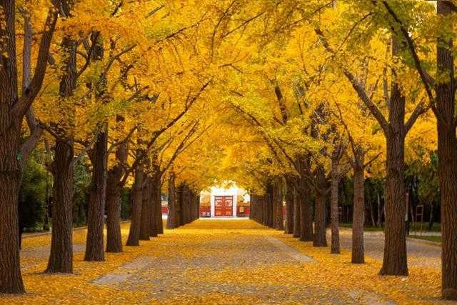 北京的银杏要黄得略晚一些,往往11月初才会进入最佳观赏期,届时,由地坛公园北门进入,长约300多米的银杏大道映入眼帘,金黄银杏与古朴建筑相融,漫步其中,可以尽享这份古典秋色。在山东日照莒县浮来山,有一棵近4000年树龄的银杏,被誉为“天下银杏第一树”,可谓是植物“活化石”,11月上旬将进入最美时段,届时冠似华盖,叶片如金箔在枝头轻舞,在阳光下熠熠生辉。