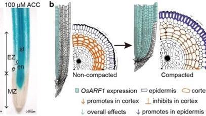 是谁在调控纤维素合成的速度,以维持对植物生长的最有利条件呢?研究团队从上千个水稻基因中找到了关键调控因子OsARF1。当根系遇到板结土壤时,土壤中积累的气体激素乙烯会激活OsARF1,使其从根系中心扩散到皮层细胞,抑制纤维素合成酶基因的表达,最终导致皮层细胞壁变薄变软,根系得以径向膨胀变粗。并通过进一步实验验证,发现缺失OsARF1的突变体根系纤细、无法膨胀;过量表达OsARF1的植株根系粗壮、穿透力强。以上证明了乙烯-OsARF1-纤维素合成酶这条调控链路,正是植物应对土壤板结的关键策略。