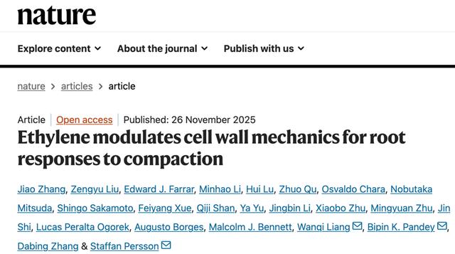 近日,上海交通大学生命科学技术学院张大兵和梁婉琪教授团队联合丹麦哥本哈根大学Staffan Persson教授团队、英国诺丁汉大学Malcolm J. Bennett教授团队在国际学术期刊《自然》上发表最新研究(题为:“Ethylene modulates cell wall mechanics for root responses to compaction”),首次揭示了植物根系利用工程学原理适应板结土壤:通过主动响应积累的乙烯,精细调控细胞壁厚度,促进根系增粗,提高穿透能力以适应土壤板结。