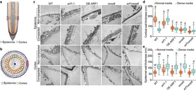 在工程学中,管道设计遵循这样的原则:当管道内部承受相同压力时,管径越大,所需的壁厚就越厚才能维持结构稳定性。植物根系巧妙地应用了这一原理:表皮细胞的细胞壁增厚变硬,像“盔甲”一样提供坚固的外层保护;皮层细胞孔径大,细胞壁变薄变软,允许细胞径向膨胀,形成更大的横截面产生推力穿透土壤。这种差异化的细胞壁重塑策略让根系既能产生足够的推力推开板结土壤,又能维持结构的完整性。