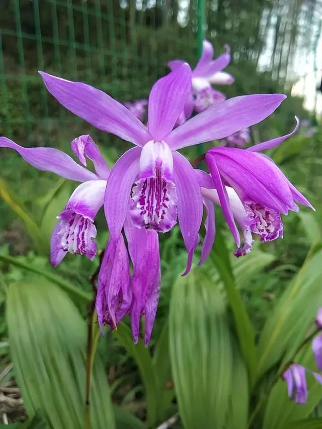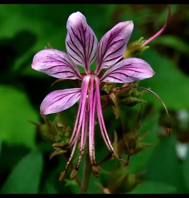 白带淡紫红色(或粉红)花瓣上有深紫红色脉纹,长长的雄蕊伸出于花瓣外,很灵动。