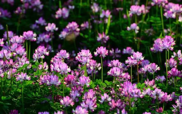 紫云英的花朵通常5-10朵簇生在细长的花梗顶端,有着紫红色和橙黄色,通常见到的是紫红色的,成片开放粉如霞。