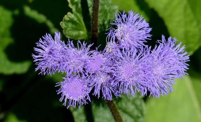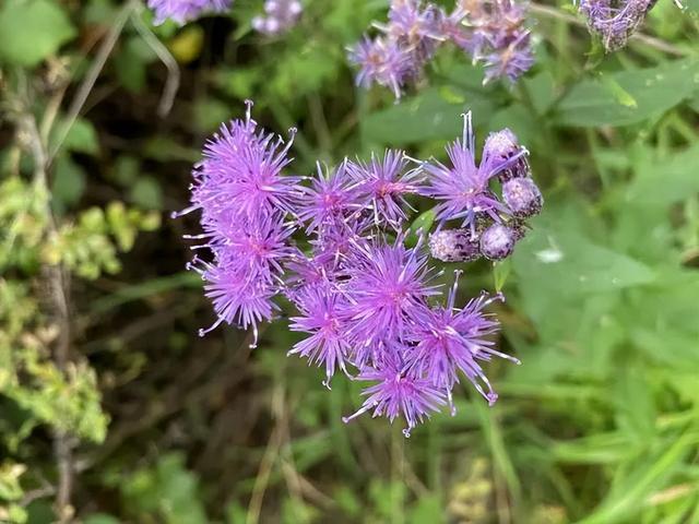 藿香蓟的花呈淡紫色,通常4-18个在茎顶排成通常紧密的伞房状花序,看上去也是毛绒绒的。