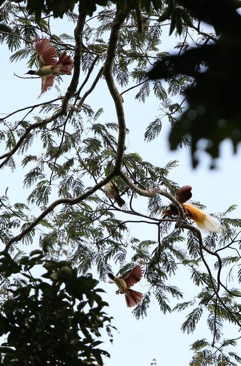 12月3日,在印度尼西亚西南巴布亚省坦布劳县原始森林一处观鸟点,几只天堂鸟在树梢上嬉戏。新华社记者叶平凡 摄
