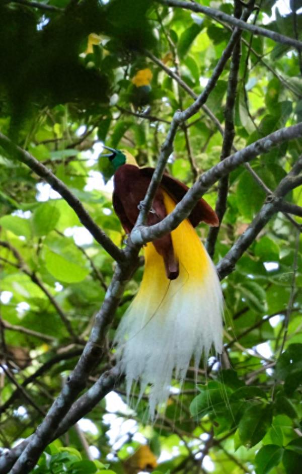 当第一缕阳光穿过密林,鸟儿们开始练嗓,清脆悠扬的奏鸣曲此起彼伏。我们竖起耳朵睁大眼睛,希望不要错过任何一睹天堂鸟芳容的机会。可是,对于非专业人士来说,在林深叶茂的雨林中寻找体型较小、飘忽不定的鸟类踪迹,无异于大海捞针。好在身边有保护区工作人员指引,从小生长在此练就了他们的火眼金睛,多次用手势提示我们鸟儿的方位。不到两个小时时间里,我先后3次观测到尾羽如瀑布倾泻的华美风鸟(天堂鸟一种),甚至看到雌雄鸟嬉戏共舞的场景。虽然每次都是惊鸿一瞥,但终得偿所愿。
