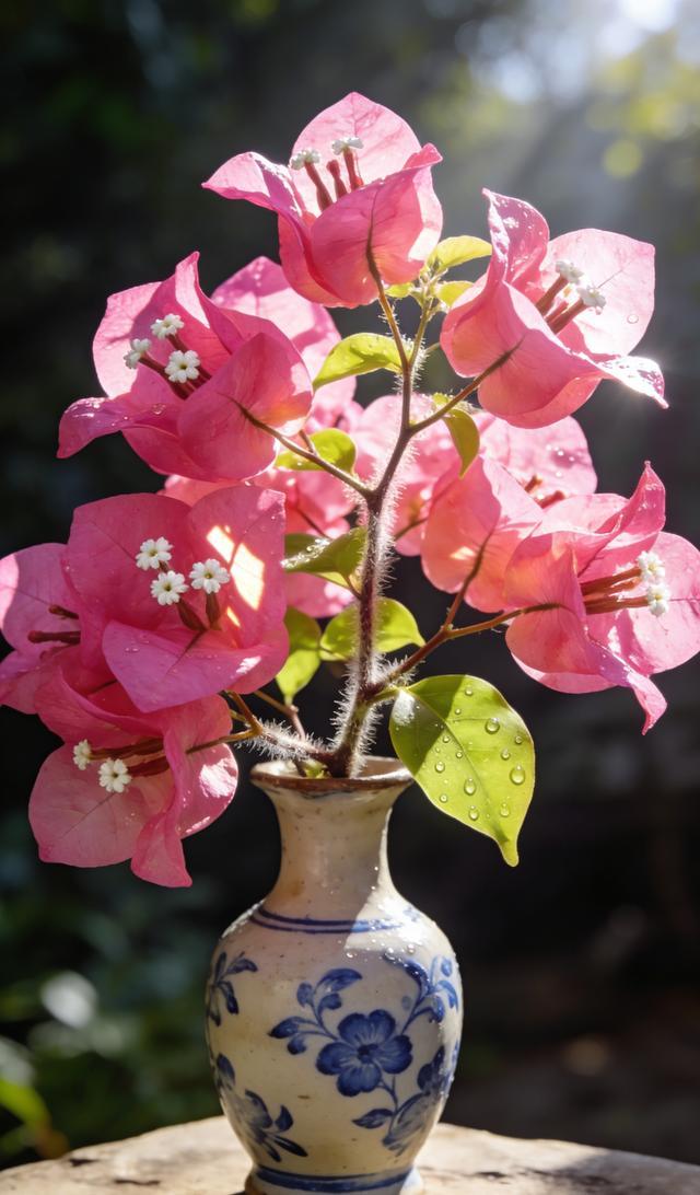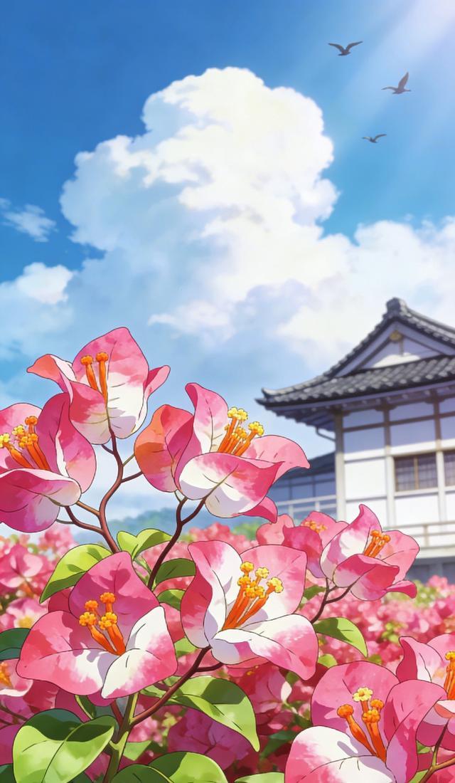 三角梅的观赏重点在苞片,而红缨的苞片堪称“色彩炸弹”。它的苞片不是单一的红色,而是红中带粉、粉中透白,边缘还带着波浪状的褶皱,像缀满了细碎的流苏,在阳光下能折射出不同的光泽。更神奇的是,红缨的花色会随光照和温度变化,有时偏玫红,有时偏浅粉,一株能开出“渐变花海”的效果,远远望去,比玫瑰还艳丽,是庭院里最吸睛的存在。