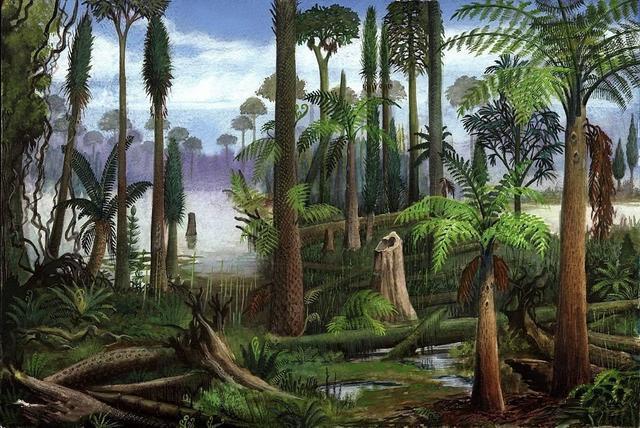 石炭纪因为化石和炭层经常一起出现而得名。这是地球陆地上植物最茂盛的时代,也是乔木诞生的时期,让植物储存碳的能力大大提升。