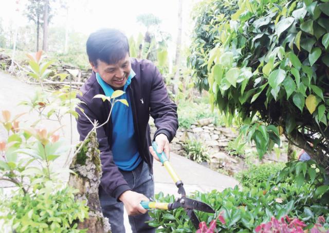 彭水县龙塘乡石院村,村民卢国军正在修剪自己栽种的绿植。受访者供图