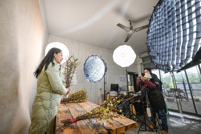 北碚区静观镇素心村,村民正在直播间介绍蜡梅花。首席记者 龙帆 摄/视觉重庆