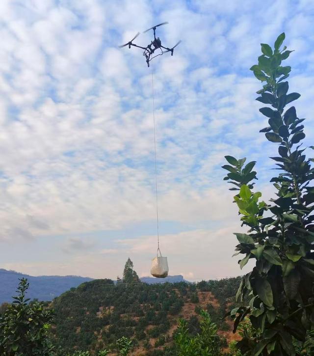 无人机在果园吊运。新华社发