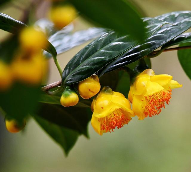 在生长习性上,金花茶保持着茶科植物与生俱来的优雅从容。每年春末夏初的四五月间,它便开始舒展新绿;待到七八月盛夏,枝头便缀满待放的花苞。当秋风吹落第一片枫叶时,金花茶却在十二月悄然绽放,一直将这场花期盛宴延续到来年三四月。长达半年的花期,让它成为植物王国里最持久的舞者,在季节更迭中演绎着不落幕的芳华。