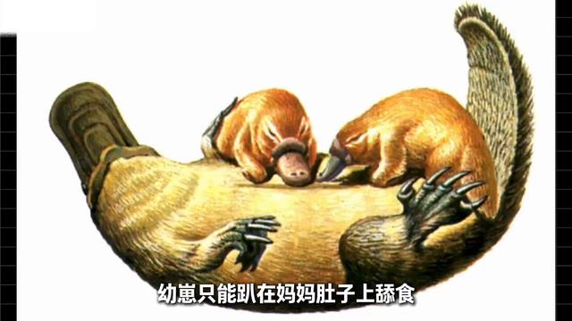 ·第二虽然下蛋,它又喂奶,但它没有乳头,奶水像汗一样从肚皮上的乳腺沟里渗出来,幼崽只能趴在妈妈肚子上舔食。